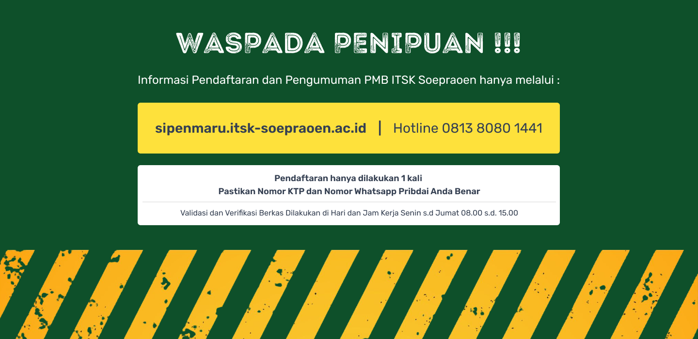 pmb.itsk-soepraoen.ac.id pilih menu daftar PMB dan ikuti pendaftaran sesuai alur, jika mengalami kesulitan bisa menghubungi contact person (CP) untuk dipandu/diarahkan. Jika daftar langsung, bisa datang ke sekertariat PMB di kampus 3 ITSK RS dr. Soepraoen pada Senin – Jum’at jam 08.00-15.00. Jl. Majapahit Kota Malang
